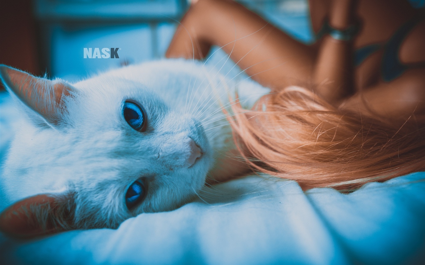 Cat and girl, bed 1440x900 Wallpaper