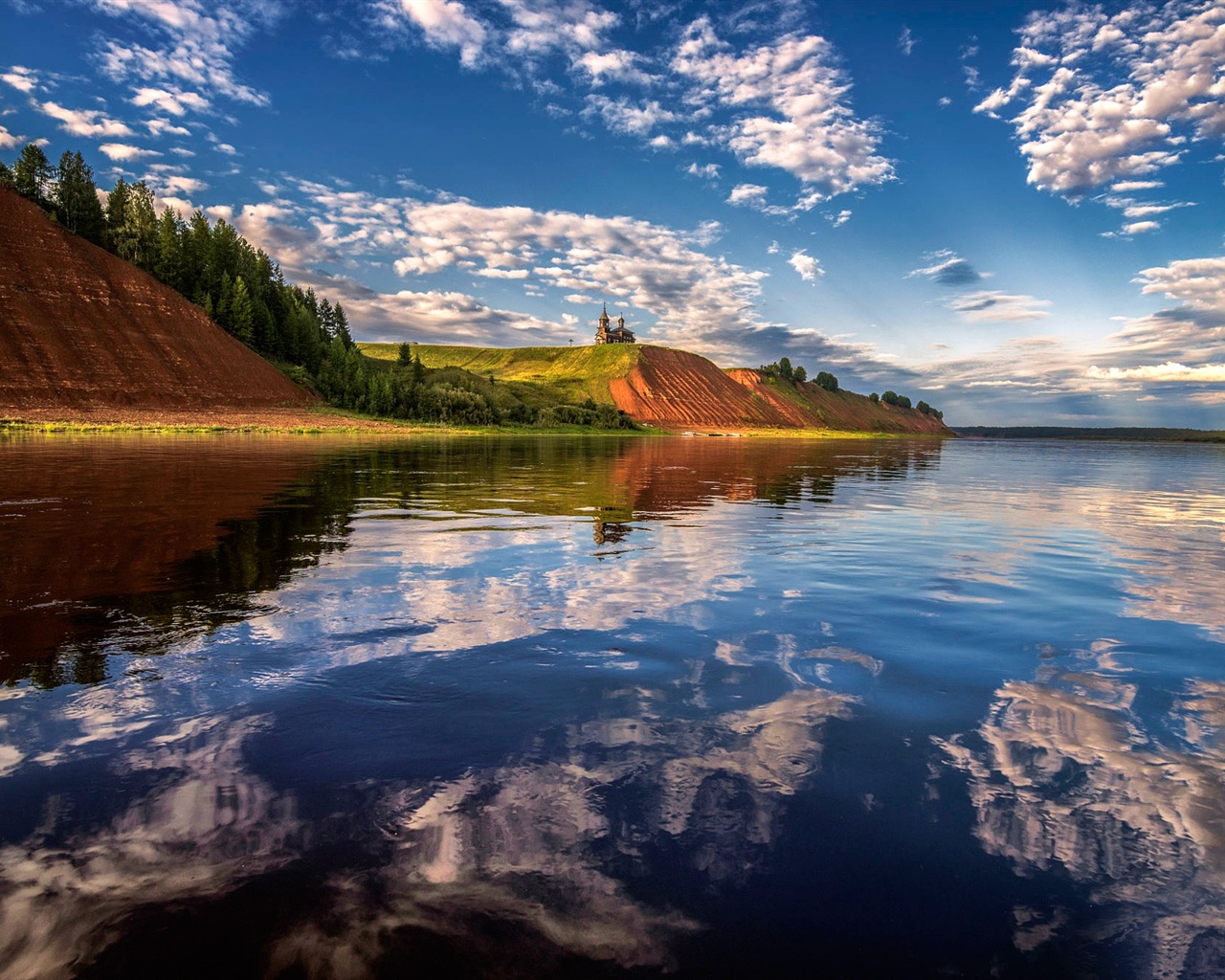 Mezen river, Russia, castle, water reflection, clouds 1280x1024 Wallpaper