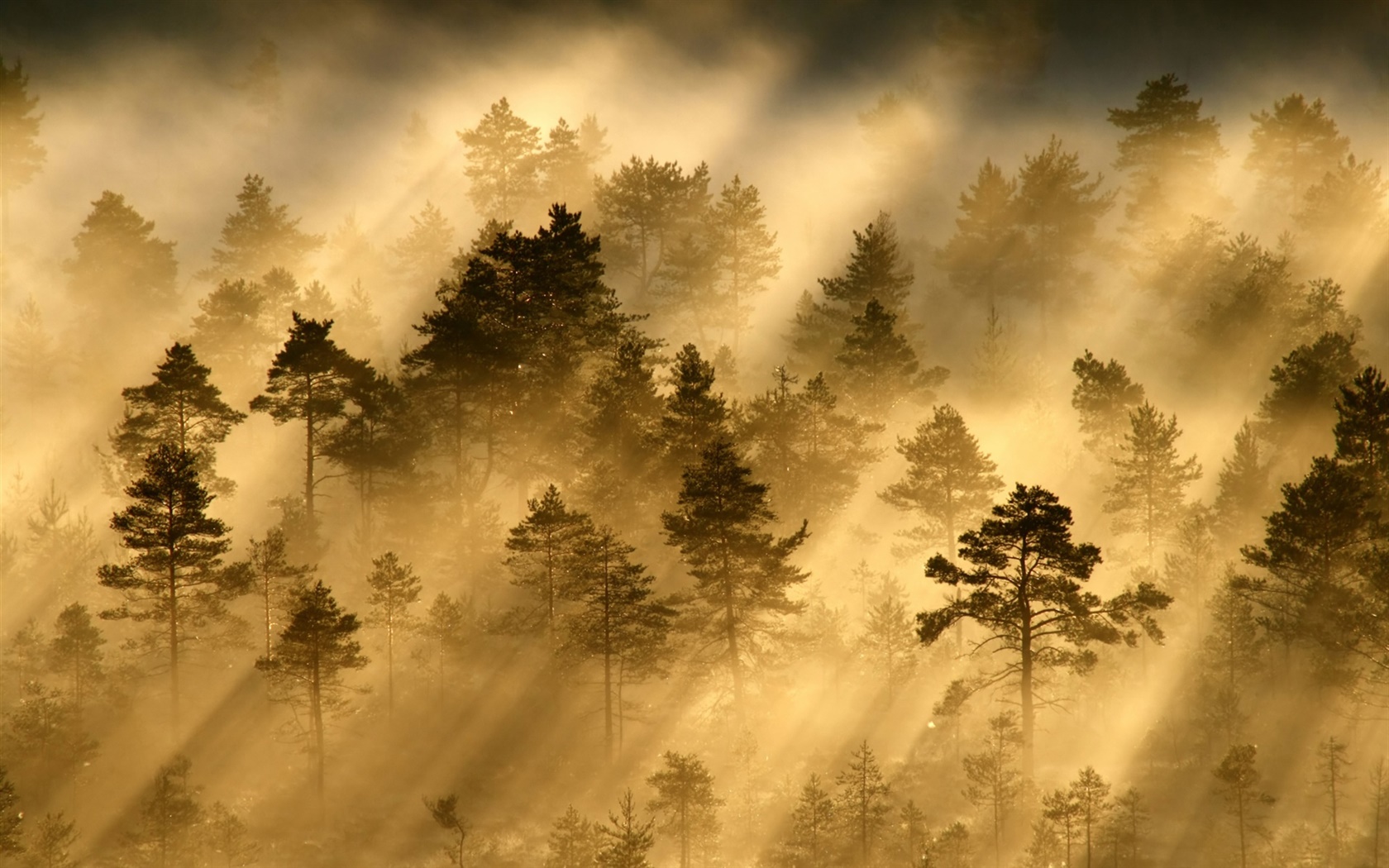 Morning, forest, trees, fog, light, sun rays 1680x1050 Wallpaper